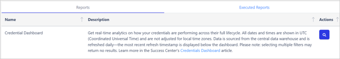In Credential Reporting, you will find two tabs: the "Reports" tab, which lists all available reporting options, and the "Executed Reports" tab, where you can access downloadable reports that have been previously generated.