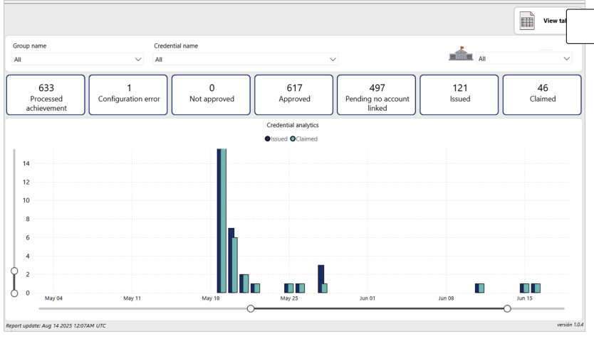 - View Table/View Graph toggle to the right of the Filters - this tool lets you see the individual student credential data that is shown in the graph including the student name and dates issued/claimed