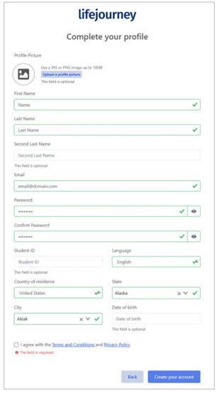 Next complete your personal details to set up your full profile. Adding a profile picture is optional. Including your location information ensures that we can offer the right features to you in the application. Please agree to the terms and conditions of using the app and acknowledge the privacy policies. Select Create your account to continue.