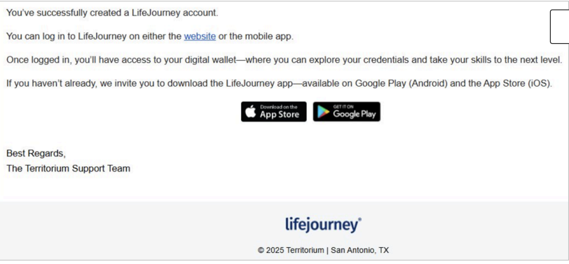 When your account is created you will receive a confirmation email. This email will be received from the address support-lifejourney@territorium.com and the subject will be “New Account Lifejourney.”