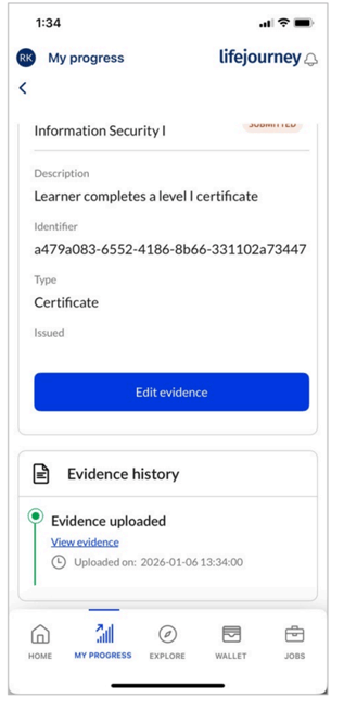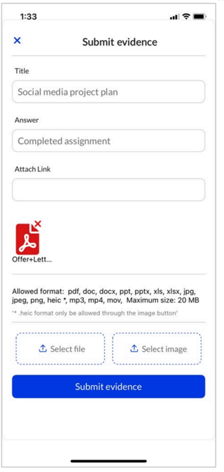 Click through the learning outcome until you get to the Achievement details screen. Click Submit evidence. Complete the Title, Answer, and add the link, file or image. Multiple evidence files may be added.