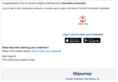 Once the administrator approves your submission, you will get a notification that a new credential is added to your wallet. You will receive an email asking you to login to “claim” it. You can complete this via the Web or mobile app.