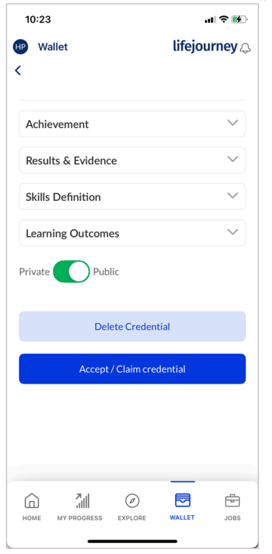 Please make sure to claim your credentials as soon as possible. Without claiming the badges, you will have less information available to use the rest of the LifeJourney services. In addition, if your institution is issuing a CLR credential to you that relates to previous badges you have earned (such as a final credential for completing a micro-credential), it will not be able to do so until you have accepted and stored all the required previously issued credential.