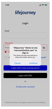 Access the LifeJourney app from either the iOS or Android app stores. When the app opens, enter your email address. Do not use the Create Your Account link on this page. If your institution has configured SSO, it will recognize your email format and change your login screen to provide a black login button specific to your provider (the example below shows this institution is using Microsoft). Click that button to proceed.