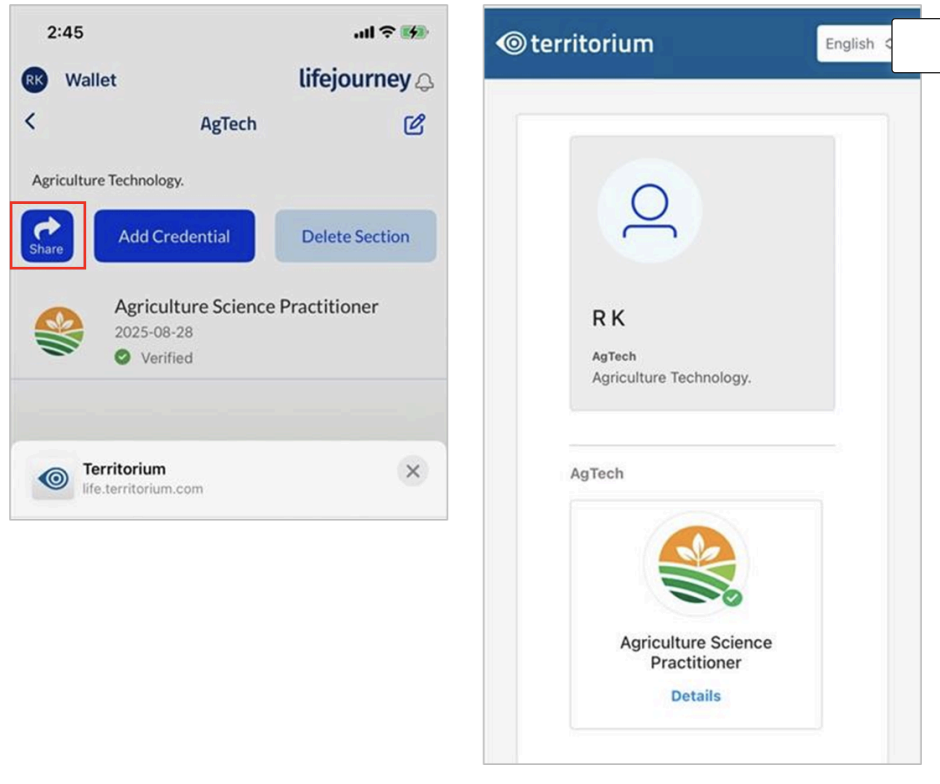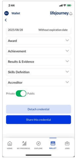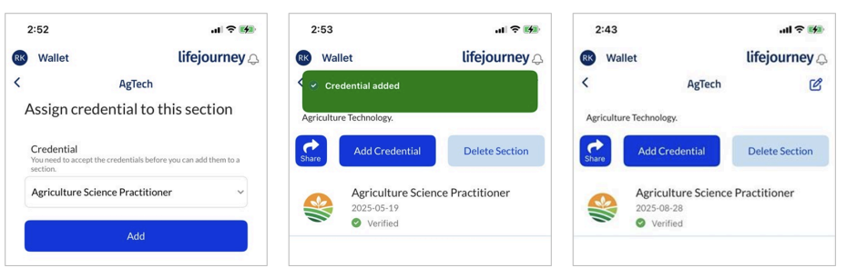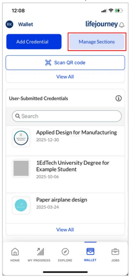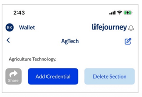 If you need to share multiple credentials at one time, you can use the Sections feature in your LifeJourney wallet. You can create and manage sections of your wallet to any type of use case to making a custom collection to share with a unique audience, to group credentials of similar skills, or groups of related achievement types.