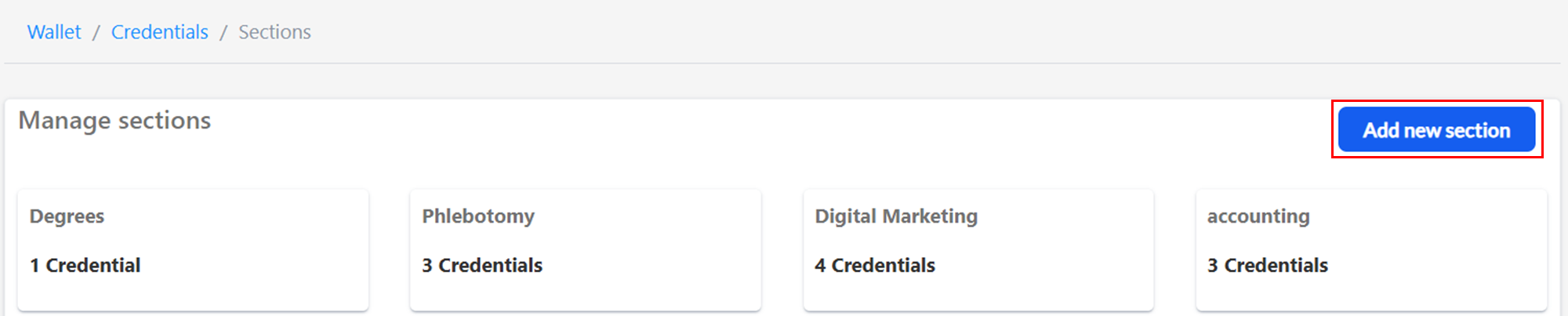Click on the section to begin adding credentials to the section. Select the blue Add Credential button.