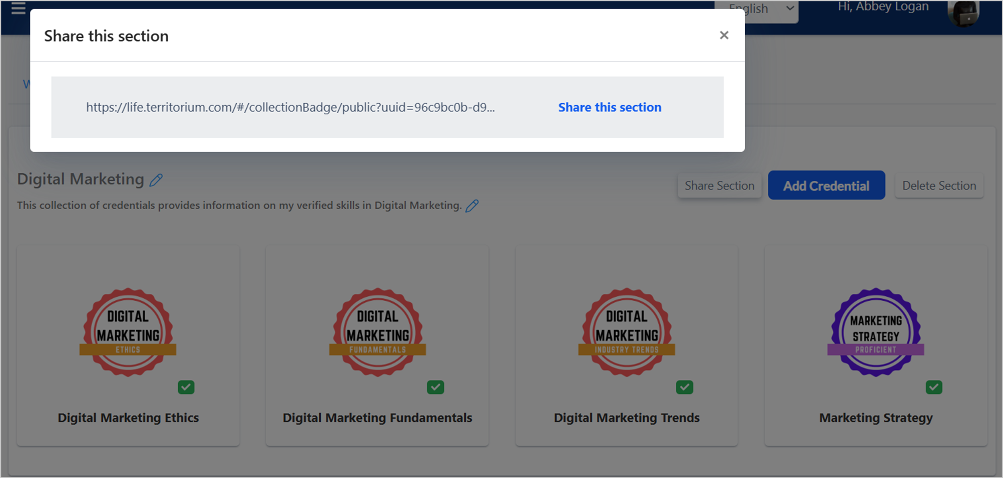 If you need to share multiple credentials at one time, you can use the Sections feature in your LifeJourney wallet. You can create and manage sections of your wallet to any type of use case to making a custom collection to share with a unique audience, to group credentials of similar skills, or groups of related achievement types.