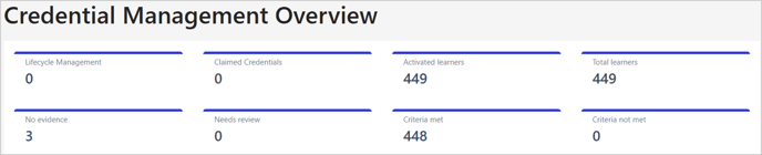 The Credential Management Overview provides a snapshot of credentialing activity and learner engagement. It consolidates key indicators related to credential issuance, learner participation, and review statuses, enabling quick assessment of overall program progress.