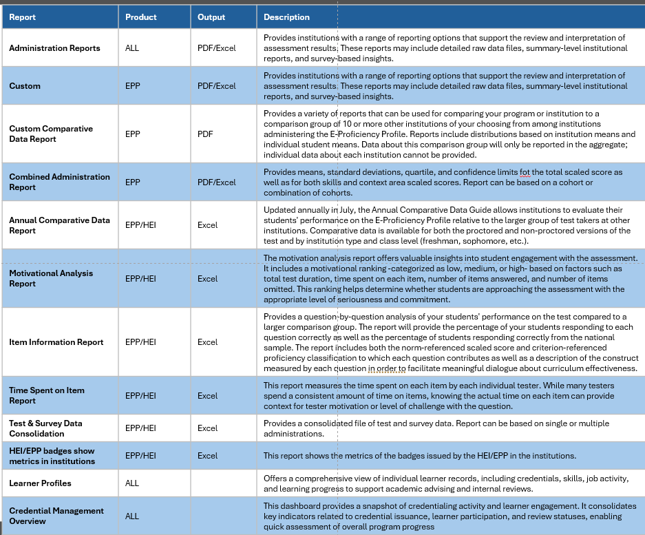 The HEI/EPP badges show metrics in institutions dashboard although not eloquently named, still provides important information. View individual Administrations, groups, tests, or credential metrics. Click on View table lists individual records with the ability to export.