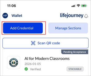 Select the Add Credential button on the Wallet to add a credential you have earned elsewhere to your Wallet.